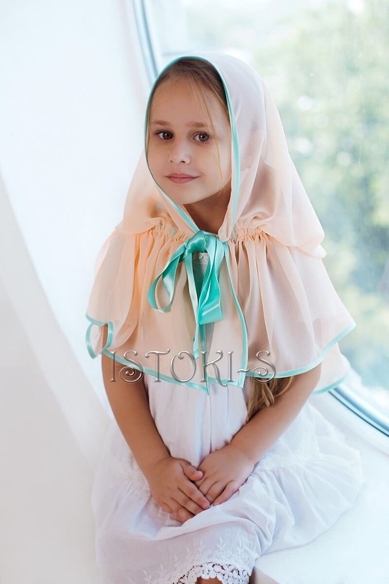 Персиковый платок Evmenia на девочку Персиковый платок Evmenia на девочку является изделием дизайнера Юлии Сеньковской, которая создала очень красивый платок для маленьких фей. Платок изготовлен из легкого однотонного шелкового шифона, отделан контрастной атласной лентой бирюзового цвета и завязывается на широкие бирюзовые ленты. Платок не только прикрывает головку ребенка, но и плечи. Как приучить дочь к ношению платка? Чтобы приучить дочь к ношению платка, как и в любом приучении малышки нужно набраться терпения и использовать ухищрения. Но, если первым платком для приучения станет представленный на этой странице нашей лавки персиковый платок Evmenia, об ухищрениях можно забыть. Он настолько нежен и красив, что не оставит равнодушной ни одну принцессу и она сама будет просить Вас надеть этот платочек на нее. Пусть Ваш маленький ангел выберет этот персиковый платочек самостоятельно в нашей лавке, а мы позаботимся о том, чтобы он скорее оказался у нее! ХАРАКТЕРИСТИКИАртикул: E-005