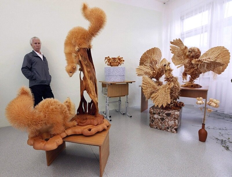 Сегодня хочу немного отойти от тематики канала и рассказать о необычном художнике, создающим потрясающие скульптуры из дерева. Почему тогда художник, если делает скульптуры? Все просто - его творчество скорее воплощение фантазии, нежели копирование существующих объектов, как в классической скульптуре, плюс сам творческий процесс можно сравнить с написанием картины, где с каждым мазком кисти появляется рисунок, здесь же с каждым новым элементом скульптура приобретает форму и вид. И так... Сергей Бобков - простой российский учитель из провинции. К этому виду творчества пришел далеко не сразу, он занимался резьбой по дереву, плетение из лозы, керамика и только в 48 лет начал создавать свои скульптуры животных из древесной стружки. Надо отметить, что это уникальная техника, которую Сергей уже запатентовал. Первое его творение - скульптура птицы и с тех пор он создал массу выдающихся инсталляций. Прежде чем приступить к созданию скульптуры из дерева - создается прототип из