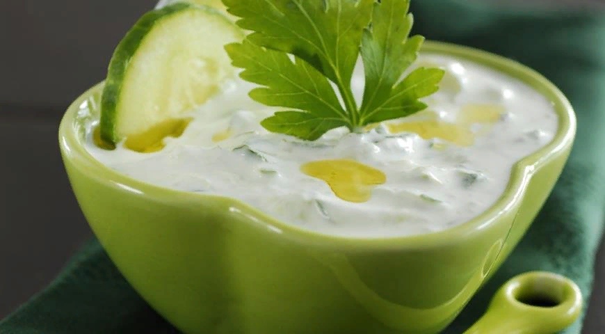 -сметана (или натуральный не сладкий йогурт) -огурец - 1 шт -чеснок - 3 -4 зубчика -зелень укропа -соль -перец Огурец вымыть, натереть на мелкой терке. Сложить мякоть огурца в сито, чтобы лишняя жидкость слилась. Чеснок очистить и пропустить через пресс. В сметану добавить измельченный огурец, измельченный чеснок и укроп, соль, перец, все перемешать.