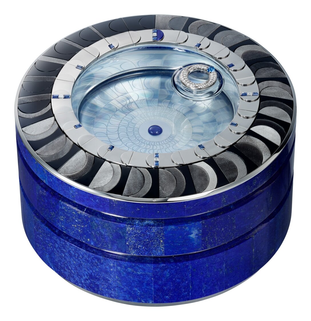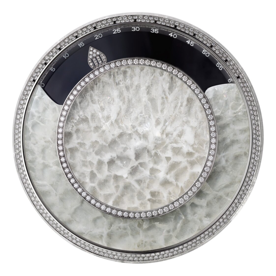 Новинки SIHH 2018. Обозревая новинки женевского часового салона SIHH 2018, мы ни словом не обмолвились о серии замечательных настольных часов, которые можно было увидеть на стенде Cartier. Исправляем это маленькое недоразумение. High Jewelry Magnetic Clock Магнетически красивые часы в корпусе из белого золота и лазурита весом 6,112.50 карат. Циферблат выполнен из белого золота. Для отделки модели использованы 1 сапфир весом 0,34 карата, 66 бриллиантов весом 0,37 карат. Для отделки циферблата потребовались 16 сапфиров весом 1,57 карат, обсидиан и оникс, 4 бриллианта огранки принцесса весом 0,18 карат. Тыльная сторона корпуса отделана перламутровой мозаикой. Внутри установлен механизм с ручным подзаводом. Часы выполнены в единственном экземпляре. High Jewelry Chronoscope Сlock Часы из белого золота и полупрозрачного кварца работают на базе калибра 6002 MC с ручным подзаводом. В верхней части перламутрового циферблата выделена зона под ретроградную минутную шкалу. Для отделки использов