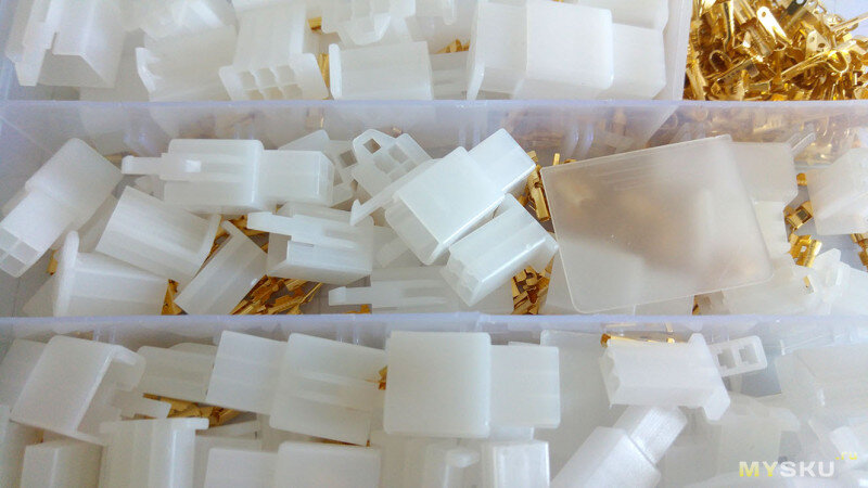 Понадобились тут как-то разъёмы по мощности типа молексов, но не молексы. Ну не нравятся они мне. То не вставляются — из-за постоянного перекоса контактов. То не вытаскиваются. И вот тут на глаза мне попался интересный набор разъёмов. О нём и обзор. Набор поставляется в такой вот коробочке: Размер маленькой клетки фона — 1 см. Обзор фона Внутри всё свалено в кучу. Хотя прослеживается некая попытка хранить предметы раздельно. Набор состоит из корпусов разъёмов и контактов... ► Расширенная версия обзора доступна на сайте MYSKU.ru Теперь самое интересное. Максимальный ток. При пропускании через контакт 6 Ампер, он нагревается, но не сильно, пластик не плавится, не размягчается при этой температуре. Поэтому, думаю это его максимум. Так же нужно учесть, что контакты новые и со временем, при окислении этот нагрев усилится. При необходимости пропускания бОльшего тока, нужно параллельно использовать несколько контактов из разъёма или несколько разъёмов.