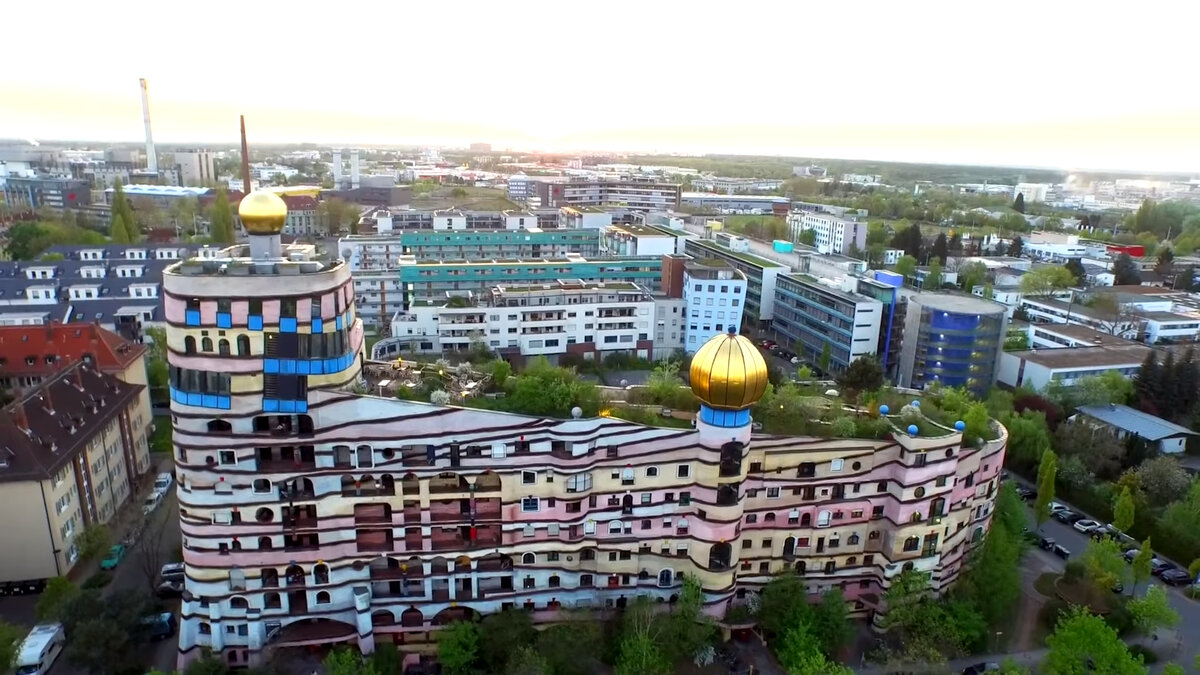 «Лесная спираль» - это жилой комплекс в немецком городе Дармштадт, выполненный в виде спирали. Здания были спроектированы уроженцем Австрии архитектором и художника Фриденсрайхом Хундертвассером и интересны тем, что абсолютно не имеют прямых углов. Комплекс был сдан в эксплуатацию в 2000 году через пару месяцев после смерти архитектора. Удивительное оригинальное здание имеет 12 этажей и исполнено в виде подковы, на его крыше расположен огромный сад, где жители могут встреть клены, буки и другие лесные деревья и кустарники, общая сложность которых превышает 250 единиц. В здании расположено 105 квартир, а также офисные помещения, около 20 общественных и частных террас, ресторан и коктейльный бар. Над каждым окном возвышается корона, так каждый житель дома может почувствовать себя настоящим королем. Архитектор был уверен, что жизнь в серых однотипных коробках очень вредит психологическому и физическому здоровью личности, а сад на крыше был создан, потому что Хундертвассер считал, что люд
