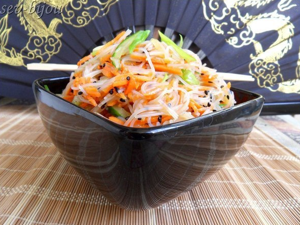 Фунчозу заливаем кипяточком на десять минуток, после нужно слить водичку и промыть холодной водичкой прозрачную лапшу. Далее нужно морковку перемешать с фунчозой, и кунжутом, огурчики нарубить тонкими брусочками и так же добавить к лапше с морковкой и кунжутом. Ну и на свое усмотрение салатик можно приправить соевым соусом.