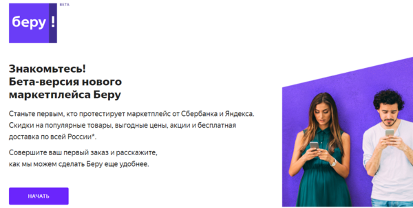 21 мая «Сбербанк» и «Яндекс» совместно запустили тестовую версию интернет-магазина «Беру» со службой доставки. Авторизоваться в сервисе можно через «Яндекс.Почту» и социальные сети. В бета-версии каталога сайта представлены семь основных категорий: На данный момент в каталоге перечислены 25 тысяч товаров, позже число товаров вырастет до 1 млн позиций. В новом интернет-магазине можно купить буквально все: от деталей для компьютеров до детского питания. На часть товаров выставлены скидки в разделе «Наши акции». Кроме того, в сервисе действует промокод BERU_MOB, дающий скидку 500 рублей на первый заказ от 2500 рублей через приложения на Android и iOS-устройствах. Доставка бесплатная при покупке на сумму от 3500 рублей. При заказе на сумму меньше 3500 рублей стоимость доставки в пункт самовывоза 99 рублей, а курьерская доставка обойдется пользователям в 249 рублей. Бета-версия сайте доступна сотрудникам «Яндекса» и «Сбербанка», а также всем желающим протестировать новый сервис. Полностью