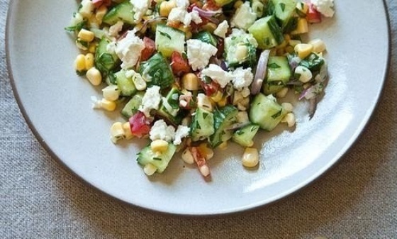 продукты: яйца 3шт помидоры 3 шт огурцы 3 шт сладкая кукуруза (консервиров) ветчина или вареная колбаса плавленный сыр (в формачках) приготовление: отвариваем яйца мелко режем помидоры, огурцы,яйца, ветчину добавляем кукурузу заливаем плавленным сыром хорошо перемешиваем и кушаем) можно зеленью украсить приятного аппетита!