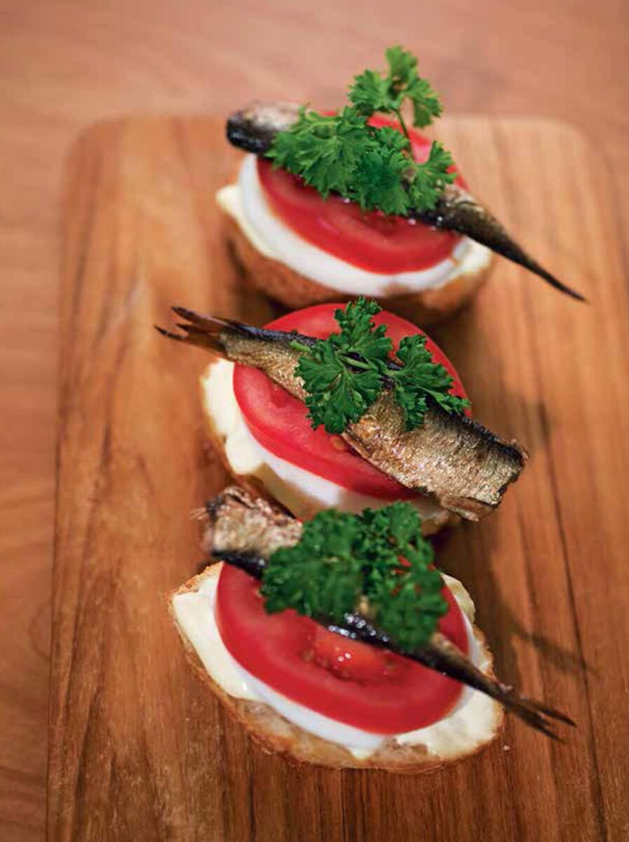 Время приготовления: 20 мин Ингредиенты: 2 яйца 2 небольших помидора 1 багет 1,5–2 ст. л. майонеза 1 зубчик чеснока 8–10 шпрот 3–4 веточки петрушки соль по вкусу Приготовление: 1. Ломтики хлеба подсушить в тостере или обжарить на сухой сковороде с обеих сторон. Дать остыть. 2. Намазать хлеб творожным сыром. Сверху выложить листочки мангольда, на них – тонкие ломтики ветчины. 3. Дополнить бутерброды маслинами и посыпать листочками тимьяна. 4. Яйца сварить вкрутую, охладить и очистить. С помощью яйцерезки нарезать ровными тонкими ломтиками. 5. Помидоры помыть, вырезать жёсткую сердцевину, нарезать тонкими кружочками. Багет нарезать ломтиками. 6. В майонез добавить пропущенный через пресс чеснок, перемешать. Смазать чесночным майонезом ломтики багета. 7. Сверху разложить ломтики яйца, на них – ломтики помидора, слегка посолить. Выложить на бутерброды шпроты и украсить листочками петрушки. Всем приятного аппетита!! Готовьте с удовольствием!! Благодарим за внимание!!