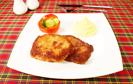 Ингредиенты: Способ приготовления: Для приготовления ромштексов из свинины желательно брать нежирные куски мяса, если же есть жировые прослойки, то их лучше срезать. При выборе мяса для нашего блюда желательно брать свежую свинину, из неё получится более нежное и сочное блюдо. Слово ромштекс переводится как кусочек мяса для жарки. Поэтому свинину необходимо нарезать брусочками или кубиками поперёк волокон толщиной примерно от 1,5 до 2 см. 1. Получившиеся кусочки нужно отбить специальным молоточком, но несильно, так как свинина и так достаточно мягкая. Затем ромштексы присыпаем специями, солью и чёрным молотым перцем. Для вкуса можно добавить специальной приправы к мясу, но это на усмотрение. 2. Перед жаркой ромштексы из свинины, смачивают. Подготавливаем панировку: в одну тарелку насыпаем немного муки, в другую панировочных сухарей. Яйца взбиваем венчиком или вилкой в глубокой миске. Для приготовления необязательно использовать муку, но лучше придерживаться рецепта, тогда свинина буд