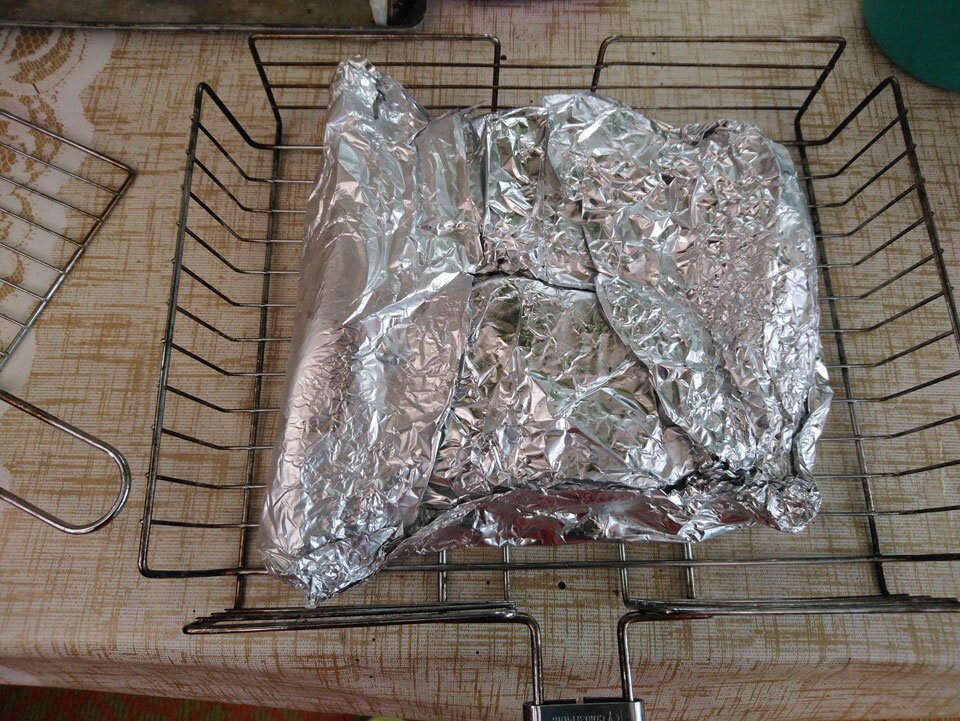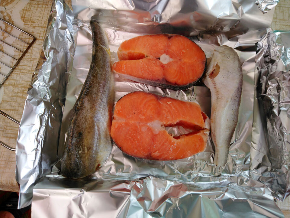 У нас было два медальона семги и чтобы заполнить решетку мы добавили пару тушек наваги. Рыба была вся ранее почищена и заморожена, размораживать не стали. Рыбу положили на фольгу.