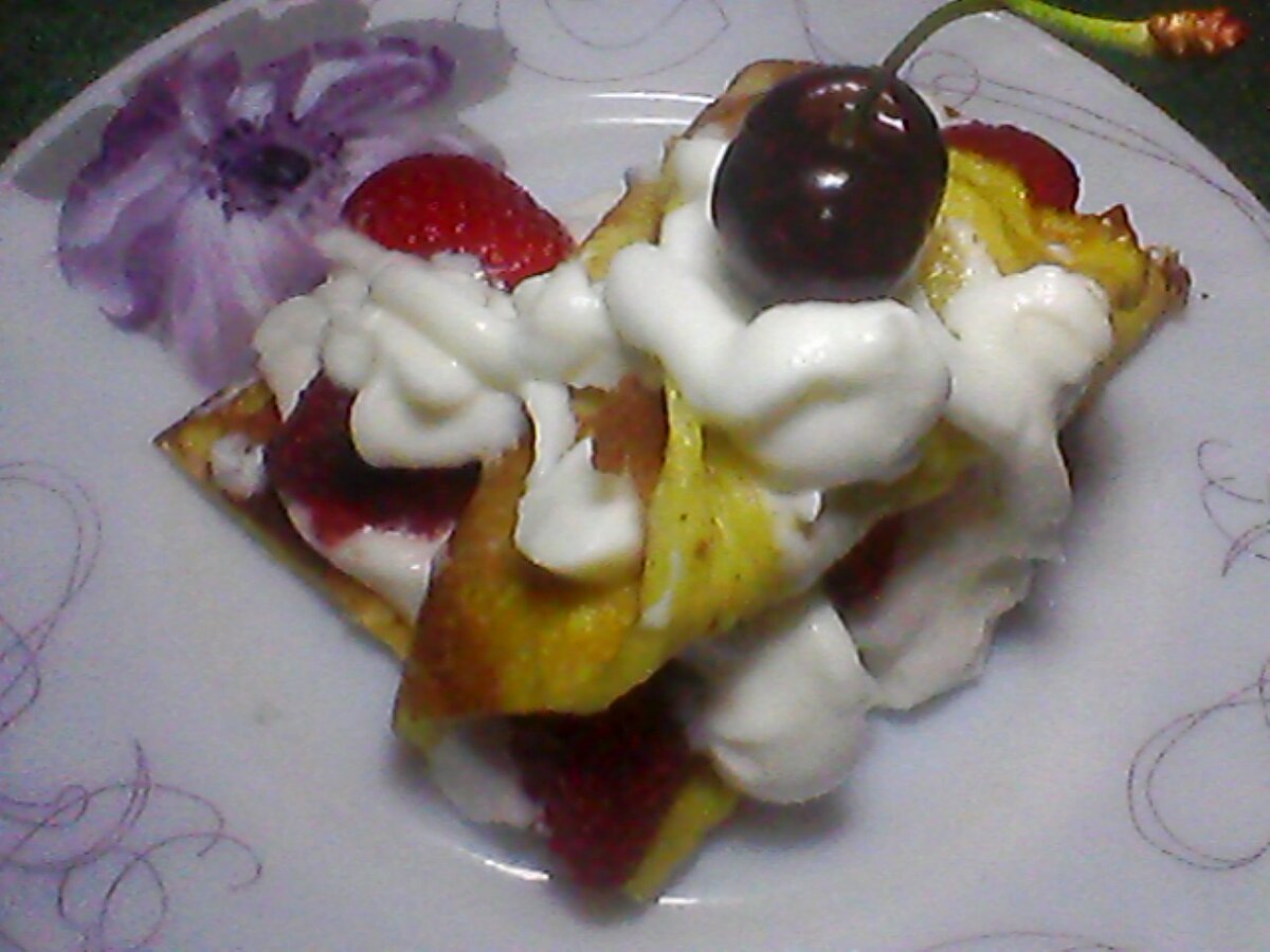 Утром к кофе хочется вкусненького, дающего заряд настроения и бодрости на весь день! Этот нехитрый десерт с ароматной клубничкой и нежной, чуть кисловатой взбитой сметанкой как раз то, что надо! ИЗ ЧЕГО ГОТОВИМ : на 2 порции - яйца куриные (3 штуки) - сахарный песок (2 ст ложки с верхом в сметану + 2 ст ложки в омлет) - ванильный сахар (10 грамм) - корица (щепотка) - молотый мускатный орех (щепотка) - клубника (6-8 штук крупной) - черешня (2 ягодки) для украшения - сметана нежирная (400 грамм) сметана еще и останется, ее можно использовать на что-либо другое или просто съесть! - загуститель сметаны (1 упаковочка в расчёте на 400 грамм сметаны) - масло сливочное (10 грамм) смазать сковородку КАК ГОТОВИМ : - Сковородку мажем сливочным маслом и сильно разогреваем. Пока сковородка нагревается делаем массу на омлет и крем из сметаны. - Масса на омлет : В миску разбиваем яйца, высыпаем сахар-песок, 2 столовые ложки сметаны, ванильный сахар, корицу - взбиваем вилкой до однородной массы. Вы