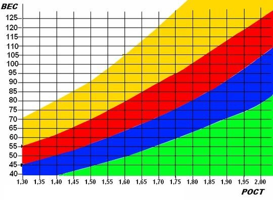 Вам кажется, что у вас есть лишние килограммы и вам срочно нужно худеть? Узнайте, так ли это на самом деле и каких рекомендаций нужно придерживаться, чтобы привести свою фигуру в норму. По вертикали указан вес (в килограммах), по горизонтали - рост (в метрах). На основании ваших нынешних параметров найдите точку пересечения веса и роста и посмотрите в какой цветовой зоне она находится. Зеленый. Вы весите меньше, чем должны. Если точка пересечения веса и роста ближе к синей зоне, то пока беспокоиться не о чем, а если значительно ниже или в середине, то вам стоит задуматься о наборе веса. Синий. Ваш вес идеален, поэтому прибегать к помощи диет не имеет смысла. Но если все же вам кажется, что ваше тело не достаточно стройное - просто займитесь спортом. Красный. У вас имеется лишний вес. Но все не так страшно и вы вполне можете справиться с ним самостоятельно. Правильное питание и спорт вам в этом станут незаменимыми помощниками. Желтый. Вы близки к ожирению, поэтому нужно срочно браться