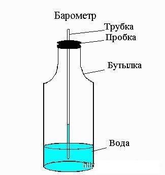 Барометр (см.рисунок) состоит из бутылки с прозрачным стеклом, стеклянной трубки и пробки. Бутылка на одну треть заполняется водой, лучше брать дисцилированную воду, поскольку обычная через год зацветает. Воду можно слегка подкрасить. В пробке делается отверстие, в которое вставляется стеклянная трубка. Место соединения замазывается пластилином. Теперь остаётся заткнуть бутылку пробкой. Барометр готов.