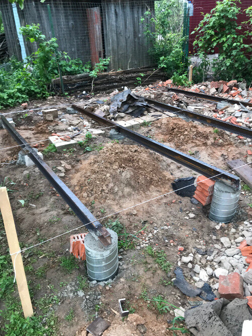 Лаги пола будем устанавливать одновременно с бетонированием столбов. Для выбора материала при строительстве ответственных конструкций активно использую сайт строительных калькуляторов ProstoBuild. Замечательный бесплатный сервис, в одной из статей обязательно подробно остановлюсь на работе с этим ресурсом. На лаги берем швеллер 10П. Для прочного сцепления швеллера с бетоном на каждый лаг привариваем по 3 «ножки» из уголка 25х25. Таким образом получили 4 заготовки будущих лаг. Для того что бы четко выдержать уровень установки лаг, с двух сторон от площадки забиваем по 3 колышка, примерно друг на против друга, на одном из кольев отмечаем верхнюю точку лага, затем с помощью уровня (лазерного или водяного) отмечаем этот уровень на остальных колышках. Натягиваем три веревки по противоположным кольям, и по ним будем выставлять лаги, тогда у нас они будут в одном уровне. Выставляем первый и четвертый лаг под высоту натянутой веревки. Ножки заводим в приготовленные столбики из вентиляционно