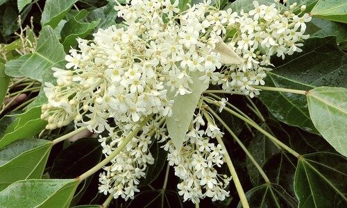 А на первом фото - цветок такого дерева. Свечные деревья, или Лумбанг, рождённые в тёплых тропических лесах Гавайев, Филиппин, Юго-Восточной Азии, вырастают до 15 - 25 метров в высоту, а когда зацветают, то выбрасывают россыпь малюсеньких белых цветов. Плод круглый, 4 - 6 см в диаметре, в котором скрываются несколько маслянистых съедобных семян. Эти семена еще называют орешками кукуи, из них и делают те самые свечи, не уступающие по свойствам привычным восковым. Благодаря полезным жирам в составе семян, из них делают масло, ценное своими увлажняющими и питательными свойствами. Масло гипоаллергенно и подходит даже для нежной детской кожи и кожи беременных. Гавайцы готовят п