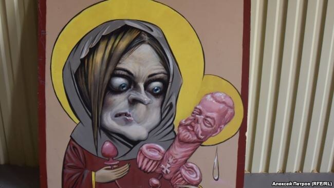 Художник Денис Лопатин нарисовал карикатуру, на которой изображена депутат Госдумы Наталья Поклонская с фаллоимитатором в виде Николая II.