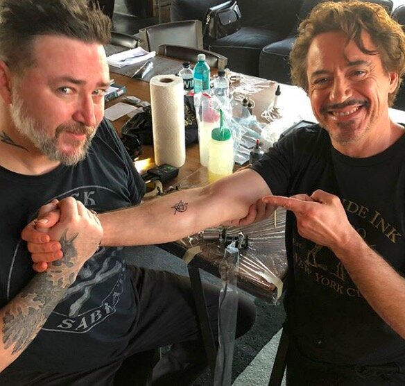 Не так давно мир облетела новость, что после плодотворного десятилетнего сотрудничества звезды "Мстителей" сделали себе одинаковые татуировки. Инициаторами выступили Скарлетт Йохансон и Крис Эванс, которые первыми набили татуировки будучи в Нью-Йорке, после чего их мастер Джош Лорд приехал в Лос-Анджелес и уже там сделал тату Дауни-младшему, Джейми Реннеру и Крису Хэмсворту. От идеи отказался только Марк Руффало, чем навлек на себя гнев фанатов, которые нелицеприятно отзывались о нем в соцсетях. Шестую татуировку вместо него нанес себе сам тату-мастер, а Дауни-младший приложил руку к одной из линий. Рисунок состоит из буквы A — символа Мстителей — и первой буквы их названия на английском (Avengers), цифры 6 (число Мстителей) и стрелки, символизирующей движение вперёд. Фанаты же увидели куда больше: щит Капитана Америки, злое лицо Халка, молот Тора, реактор Железного человека, стрелу Соколиного глаза и символ Чёрной вдовы. Хочешь сделать тату или просто полюбоваться на