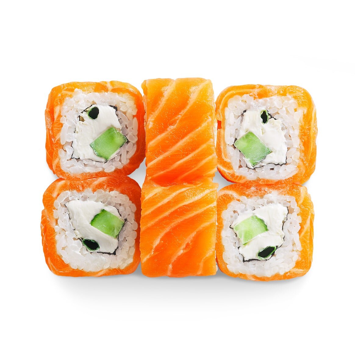 Ингредиенты к рецепту: Пошаговое приготовление с фото: Название и принцип ролла «Филадельфия» американский мастер суши, и до сих пор остается загадкой, назван этот ролл в честь американского штата или сыра. «Филадельфия» — на самом деле содержит в основе ролл урамаки, т.е. рисом наружу, но дополнительно обёрнутый тонкими ломтиками рыбы. Этот ролл очень вкусный и сытный, один из любимых и наиболее часто заказываемых роллов. Делается чаще всего из риса, нори, сливочного сыра (в идеале «Филадельфия», но можно и с любым другим сливочно-творожным сыром) и лососёвой рыбы, по желанию можно добавить авокадо или огурец. В приготовлении Филадельфии есть два сложных момента: нарезка рыбы тонкими слоями и заворачивание ролла рисом наружу. Чтобы было легче нарезать в домашних условиях тонкие ломти рыбы, можно её слегка подморозить. 1. Половину листа нори положите глянцевой стороной на циновку для роллов, обернутую пищевой плёнкой. Возьмите влажными руками горсть готового риса. 2.Разровняйте рис