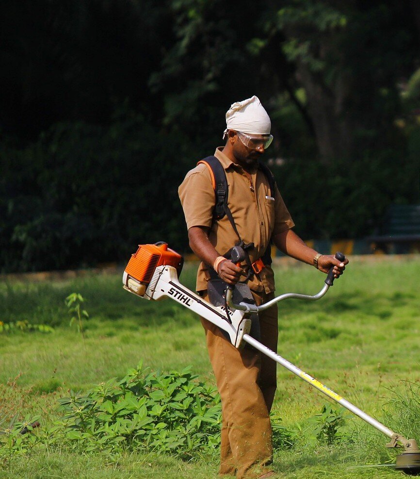 Разрешены только крупные газонокосилки, а триммер можно применять только при покосе склонов и там, где не может пройти газонокосилка.