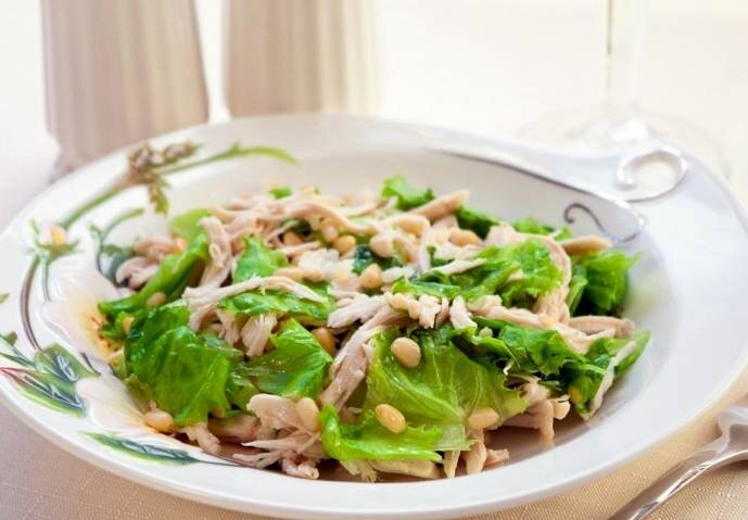 Куриный салат с приправой из яблок и моркови Число порций: 4 Ингредиенты: 350 г вчерашней жареной курицы, очищенной от кожи и нарезанной кусочками «на один укус» 50 г кедровых орешков, поджаренных 1 ст. л. оливкового масла сок 1/г лимона 2 горсти свежего шпината, промытого Приправа из яблок и моркови: 2 морковки 2 сладких столовых яблока 2 консервированных лимона, мелко накрошенных горсточка кишмиша соль и свежемолотый черный перец Приготовление: 1. Приготовьте приправу: натрите на терке морковь и уложите в миску. Разрежьте яблоки на четыре части, удалите сердцевину и натрите в ту же миску. Добавьте лимон, кишмиш и тщательно перемешайте. Посолите и поперчите. 2. Уложите шпинат в широкую и неглубокую сервировочную миску или блюдо. Сверху поместите курицу и посыпьте орешками. Перед самой подачей сбрызните оливковым маслом, лимонным соком и посолите. Подавайте с морковно-яблочной приправой. Жарьте кедровые орешки в небольшой сухой сковороде: осторожно погрейте пару минут, часто перем