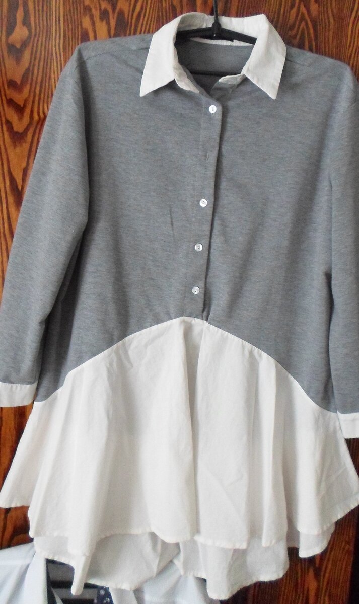 Рубашоночки с расклешенным юбочным низом были в трех цветах. Серый. Хаки. Красный. Функциональные. Милые. Удобные. Но сразу было видно, что подлежат лечению. Потому что белая ткань в отделке мялась при малейшем прикосновении и выглядела из-за этого крайне не опрятно. Пока отглаженная, еще ничего. И все же как-то печально... Ведь невозможно же носить с собой утюг 24 часа в сутки. Хотя Билан знает, что "невозможное возможно". Пришлось звать Оксану. С моим дизайном Оксана согласилась. И с выбранной для отделки тканью тоже. Но для серой рубашки захотела выбрать ткань сама. Лечение. Было решено отпороть белую отделку внизу и вшить назад уже вместе с органзой. На рукава сделать манжеты из органзы. А на воротник - воротник сверху из органзы. Для серой рубашки Оксана выбрала органзу в крупную белую ромашку. А я выбрала органзу в мелкий беленький горох. Вот так повеселела рубашоночка цвета хаки. А это отделка красной рубашоночки. А это серенькая рубашоночка. Серая рубашоночка с ромашками о