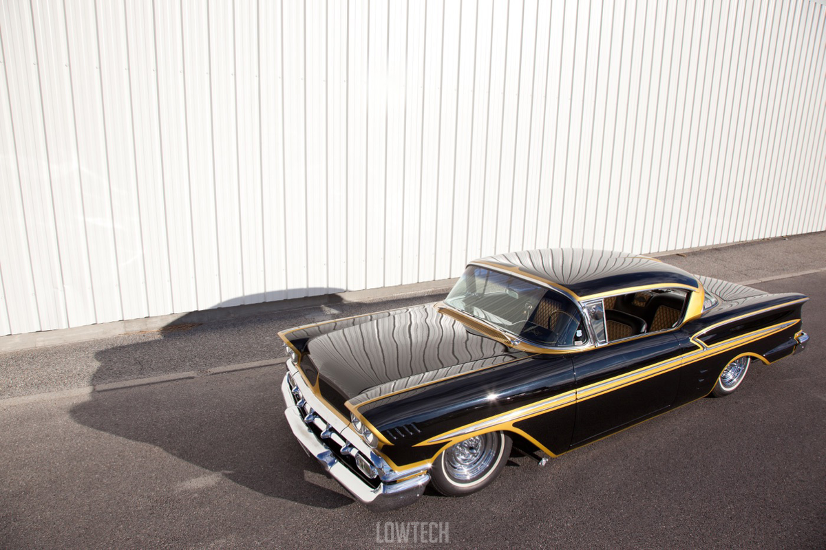 Он начал с с отделения кузова от рамы. Помимо восстановления и перекраивания железа, Момо поставил пневму и модернизировал переднюю часть дропнутыми кулаками и дисковыми тормозами. Двигатель был заменен на смолл-блок Chevrolet на 383 кубических дюйма (6,2 литра). Момо собрал его несколько лет назад для своего брата, который установил его в свою Impala SS 1962 года, — другой автомобиль, который погиб в огне в клабхаусе Crazy Cruisers.