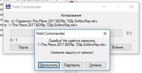 С таким вопросом ко мне на днях обратился знакомый. Он решил посмотреть скачанный с торрентов фильм, но не смог скопировать его на USB-флешку. Хотя места на ней было полно. В Total Commander появилось сообщение «Ошибка! Не удается записать файл. Снимите защиту от записи!» В Проводнике другое — «Файл слишком велик для конечной файловой системы». Флешка самая обыкновенная. Объем 16 Гб. Места для записи фильма достаточно. Другие фильмы копируются без проблем.