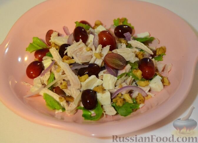 Для приготовления салата нам потребуется: 1.Куринное филе-500 гр. 2.Виноград-120 гр. 3.Зелёный салат-100 гр. 4.Помидоры-5 шт. 5.Огурцы-2 шт. 6.Лук репчатый-2 головки. 7.Растительное масло-3 ст. ложки. 8.Уксус-1 ст. ложка. 9.Виноградный сок-1 ст. ложка. 10.Чёрный молотый перец-по вкусу. 11.Соль-по вкусу. Начнём готовить: 1.Куринное филе отварить в неболшом количестве воды,охладить и снять кожу. Мякоть курицы нарезать маленькими ломтиками. 2.Огурцы нарезать кружочками,Лук нарезать кольцами,помидоры-дольками; виноградины разрезать пополам,удалить косточки(если есть); листья салата нарезать мелкой соломкой. 3.Перемешать все нарезанные продукты. 4.Соединить сок,уксус,масло,соль,перец,хорошо перемешать и заправить салат. 5.Перед подачей к столу салат выложить в салатницу иукрасить зеленью. ВСЕМ ПРИЯТНОГО АППЕТИТА!!! НЕ ЗАБЫВАЙТЕ ПОДПИСЫВАТСЯ,СТАВИТЬ ЛАЙКИ,ЕСЛИ ВАМ ПОНРАВИЛОСЬ,ПИШИТЕ ВАШИ ПОЖЕЛАНИЯ!!!
