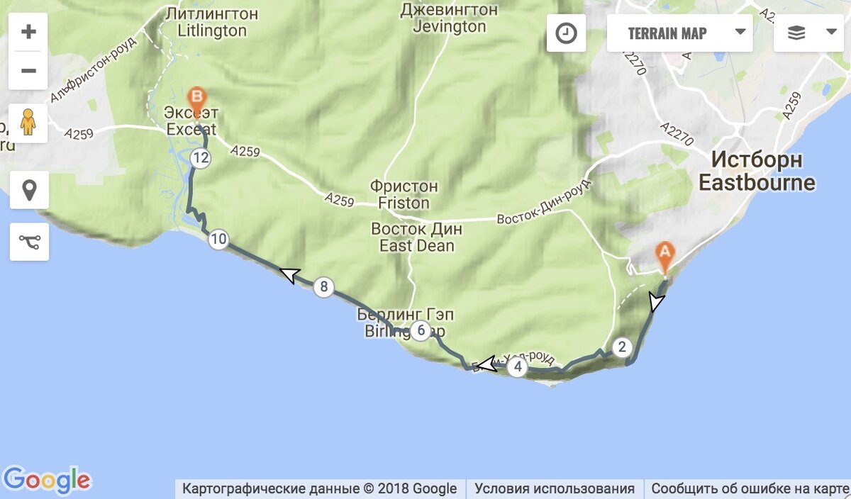 В мае 2016 года ездили с Игорем в Лондон. Больше всего за две недели меня впечатлил не город, а поездка на южное побережье Великобритании — к скалам Севен Систерс и мысу Бичи Хед. Утром сели на поезд до Истборна на вокзале Виктория (билет в один конец для одного человека — 3000 р.), пешком прошли по побережью, дошли до Сифорда, оттуда добрались на автобусе до Брайтона и сели в обратный поезд. Шли несколько часов, судя по карте, около 13 км. Но все эти 13 км ты идешь по холмам, постоянно приходится то спускаться, то подниматься. Красота вокруг невообразимая. Идешь-идешь по городу, потом вдруг заворачиваешь на маленькую дорожку, проходишь мимо забора и кустов — и перед тобой открывается вид на небо и Ла-Манш. Дух захватывает: Бичи-Хед — самая высокая скала Великобритании (162 метра). Это популярное место среди самоубийц. Вот мы еще даже не дошли до самой высокой точки: Решили сначала спуститься к морю: Потом пришлось с берега подниматься на Бичи-Хед по самому крутому подъему (а не