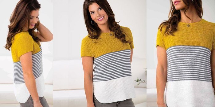 Пряжа Plymouth Yarn Cleo (100% хлопок; 115 м / 50 грамм в мотке) – 3 (4, 4, 5, 5) мотка желтого цвета (нить А), 2 мотка серого цвета (нить В) и 3 (4, 4, 4, 5) мотка белого цвета (нить С).