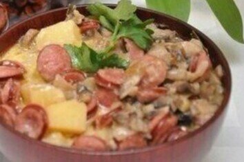 Всем привет, здесь описан очень классный и вкусный рецепт на Охотничьи колбаски с картофелем в 4 горшочках. Ингредиенты: 1. Картошка - 1кг 2.Охотничьи колбаски — 6 шт. 3.Репчатый лук — 2 шт. 4.Шампиньоны — 200 г 5.Сметана — 1 стакан 6.Бульон — 700 мл 7.Сладкая паприка — 1 ч. л. 8.Растительное масло — для обжарки 9.Соль, перец горошком, зелень, лавровый лист — по вкусу Приготовление: Картофель почистить, нарезать небольшими кубиками и чуть обжарить в растительном масле.Лук мелко порезать и обжарить вместе с грибами. Колбаску порезать кружочками.Класть в горшочки слоями: грибы с луком, охотничьи колбаски, картофель.Сметану смешать с бульоном, посолить, поперчить и залить в горшочки. Поставить в холодную духовку и готовить при температуре 150°C около 1 часа. Перед подачей посыпать зеленью. Картофель почистить, нарезать небольшими кубиками и чуть обжарить в растительном масле.Лук мелко порезать и обжарить вместе с грибами. Колбаску порезать кружочками. Картофель почистить, нареза