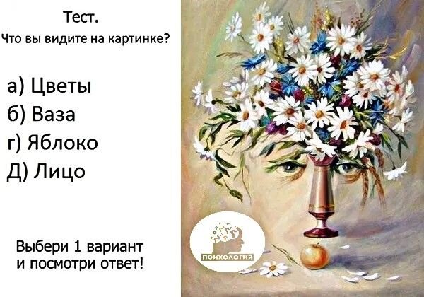 Лицо Если первым, что вам бросилось в глаза на этом изображение было лицо, то это говорит вам о том, что вы слишком много и часто комплексуете. Причем это происходит, без каких либо причин. Все что вам нужно, это всего лишь быть, немного общительней. Именно тогда в вашей жизни, наступит благоприятный момент и люди вокруг, начнут вам улыбаться. В этом нет ни чего сложного. Просто попробуйте прямо сейчас. Яблоко. Если первым, что вы заметили на изображение было яблоко, то это говорит о том, что вы тот человек, который предпочитает наблюдать и это вам приносит, хорошие плоды. Держите себя на этом же уровне и ваша жизнь, станет еще лучше. А окружающие вас люди, начнут относиться к вам, еще добрее. Ваза. Если первым, что вы заметили на изображение была ваза, то это говорит о том, что у вас великолепный аналитический склад ума, который вам нужно использовать по полной. Вам очень легко поддаются логические задачи, а окружающим людям, это очень нравиться. Вы легко добьете в своей жизни хоро