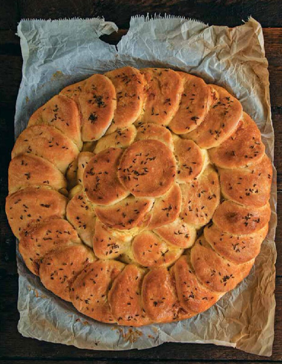 6. В сковороду по спирали выложить кружочки теста внахлёст, чтобы они заходили один на другой примерно на сантиметр. Смазать баннок растительным маслом, присыпать 1 ст. ложкой зиры.