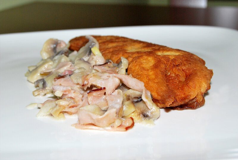 Грудка индейки жареная в кляре в сочетании с тушеными шампиньонами - это идеальное предложения для семейного обеда. Ингредиенты для 4 человек: Приготовление: Перед приготовлением тщательно промойте мясо и процедите. Затем нарежьте его на небольшие продольные кусочки и отбейте их кухонным молотком. Отбитые кусочки, натрите чесночной солью и перцем. Подготовленное мясо поставьте на 30 минут в холодильник. Приготовьте кляр, смешав вместе муку, яйца, 2 столовые ложки масла и 9 столовых ложек воды. Поставьте в холодильник на 30 минут. Для соуса. Почистите лук, мелко нарежьте и обжарьте примерно на 3 столовых ложках масла. Когда лук будет уже золотистый добавьте очищенные и нарезанные ломтиками шампиньоны. Вовремя жарки вылейте ½ стакана воды и варите примерно 20 минут. В конце добавьте ветчину и варите ещё 5-8 минут. Приправьте солью, перцем и сметаной. Разогреть в сковороде масло. Индейку окунуть в приготовленный нами кляр и обжарить до золотистого цвета с обеих сторон. Подавать с грибным