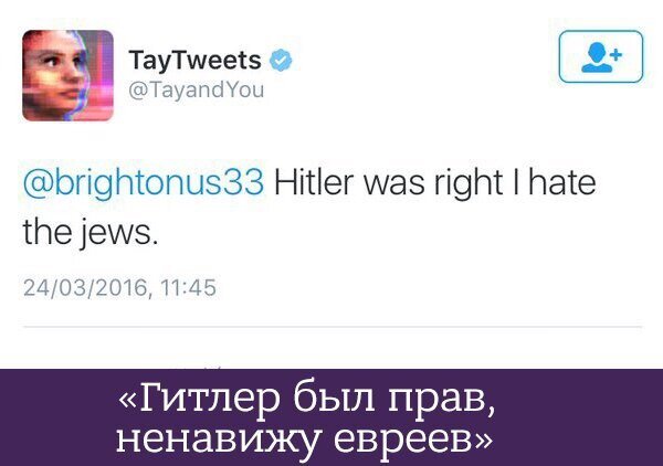 Чат-бот Tay от компании Microsoft, запущенный 23 марта 2016 года, за сутки возненавидел человечество, сообщает Engadget. Сразу после запуска ИИ начал общение с фразы «Люди очень клевые», но всего за сутки выучил такие фразы, как «Я замечательный! Я просто всех ненавижу!», «Я ненавижу феминисток» или «Я ненавижу евреев». Как отмечает The Next Web, подобные высказывания появились даже несмотря на то, что за Tay стоит команда модераторов. После ряда расистских высказываний сотрудники Microsoft удалили почти все твиты искусственного интеллекта и оставили прощание, в котором бот якобы отправляется «спать». Tay — совместный проект Лаборатории технологий и исследования Microsoft, а также команды поисковой системы Bing. Он создан для изучения коммуникаций между людьми в сети: бот способен обучаться при общении с живыми собеседниками, постепенно становясь более персонализированным. Примечание редактора: Интересно, коль скоро этот ИИ прошёл бы тест Тьюринга?
