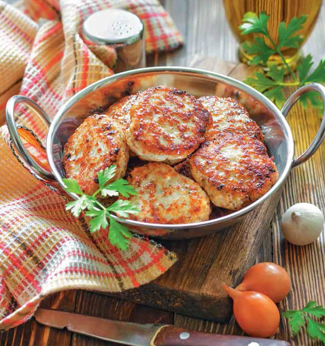 5. В сковороде разогреть растительное масло, обжарить на нём котлеты на среднем огне, с каждой стороны по 4–5 минут, до румяной корочки.