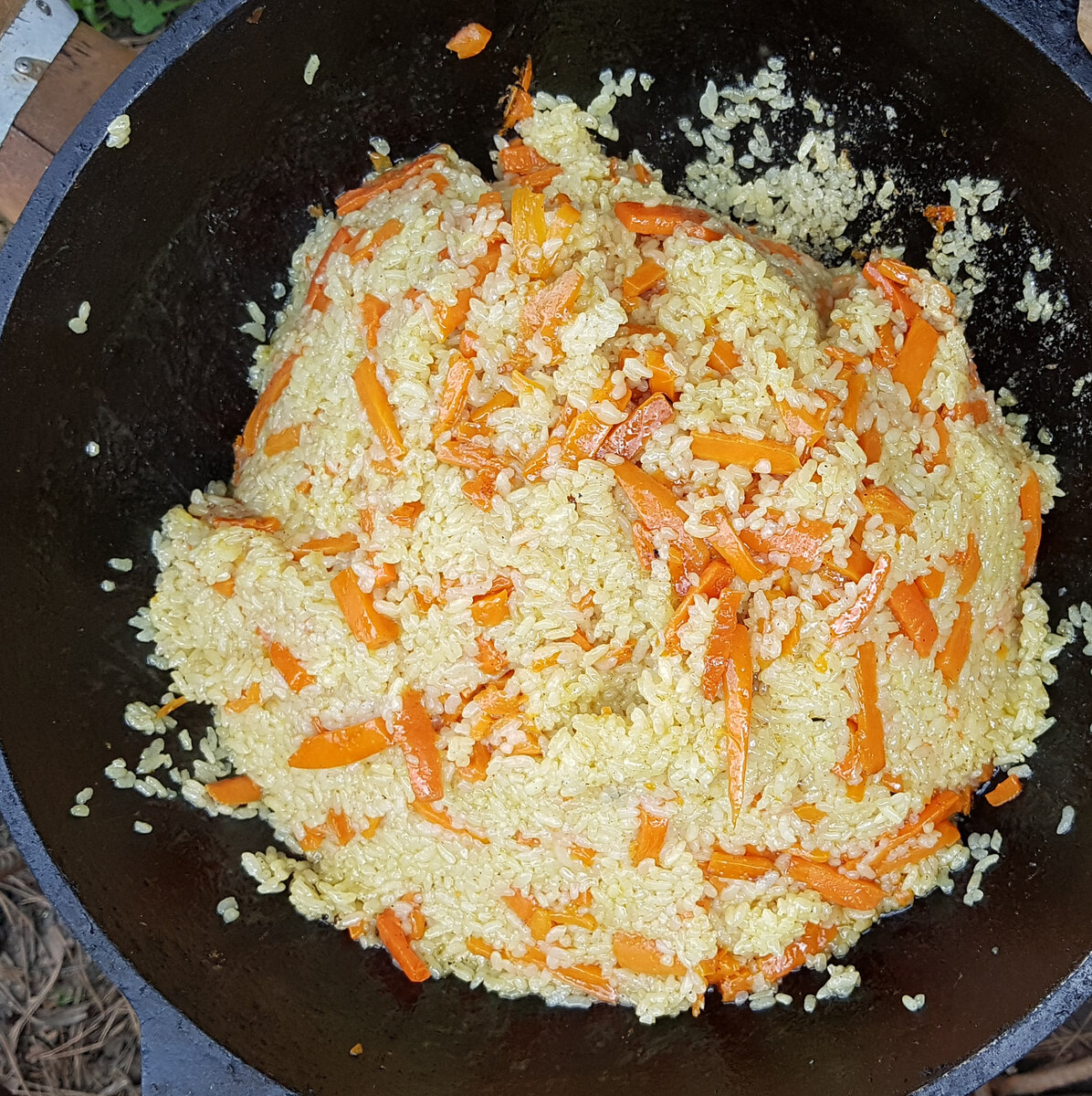 Сейчас лето и многие проводят больше времени на даче. Самая вкусная еда на природе- это еда приготовленная на огне. Хочу рассказать как приготовить очень вкусный плов. В рецепте нет мяса, но в описании напишу , когда его можно использовать. и так, что понадобиться: 1 стакан растительного масла, лучше кукурузного 3 крупных головок репчатого лука или 5 средних 1 кг сочной морковки 5 стаканов краснодарского риса 6-7 стаканов воды Специи ( Хмели-сунели, черный перец, куркума, зирра) Подготовка: Лук нарезать крупно полукольцами ; Морковку помыть и порезать полосками, или можно на специальной терке; Рис тщательно промыть; Приготовление: 1.Развести огонь, достаточно сильный, поставить казан на платформу. 2.Вылить стакан масла в казан 3. Когда масло начнет кипеть, добавить весь лук, крышку не закрывать. 4. Помешивать лук, что бы он равномерно прожаривался, убирать со стенок. 5. Когда лук достаточно сильно потемнеет, но еще не превратился в угли, начинаем доставать из масла, отжимая,
