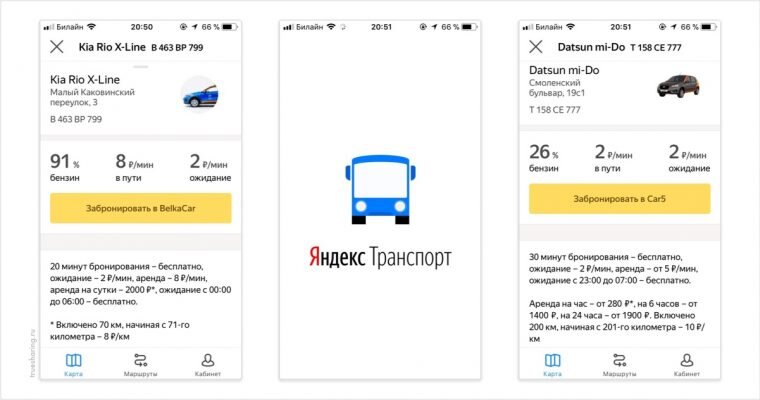 В Яндекс.Транспорте появилась подробная информация о каршеринговых автомобилях