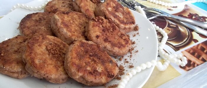 Отдельный рецепт для уважаемых любителей шоколадных десертов. Сырники тоже вполне могут быть шоколадными. Утренний кофе с шоколадными сырниками – это поистине королевский завтрак. Творог в данном рецепте целесообразнее использовать 5% жирности. Более жирный творог «потечет», сырники не будут держать форму. Состав: - творог с жирностью 5% – 250 г, - сахарный песок – 3-4 ст. л., - яйцо куриное – 1 шт., - манка – 4 ст. л., - порошок какао – 2-3 ст. л., - растительное масло для жарки. Приготовление: 1. Яйцо смешать с сахаром и какао порошком до однородной массы. 2. Творог перетереть через сито. Насытив его, таким образом, кислородом для воздушности, и избавив от комочков. 3. Добавить творог к яичной смеси. Хорошо перемешать подбор. 4. Добавить манную крупу. Дать настояться тесту 15 минут. За это время разбухнет манка, и сырники хорошо скрепятся. 5. Смочить руки в холодной воде и сформировать шарики, слегка прижав их сверху. 6. Жарить на разогретой сковороде с растительным маслом. Используй