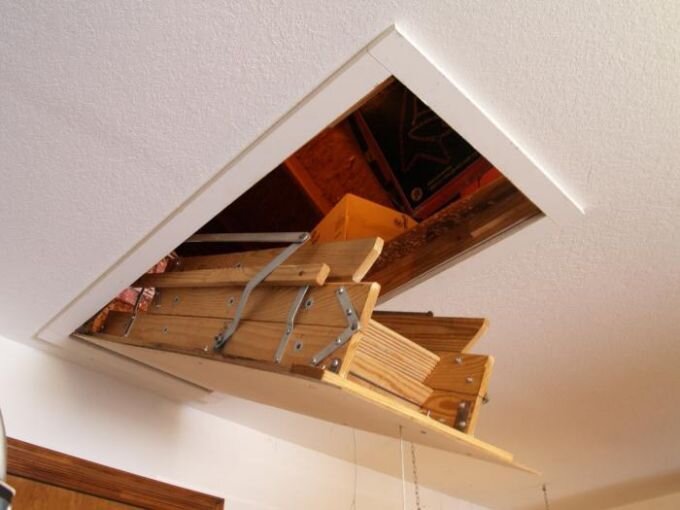 Приставной или стационарный вариант лестницы на чердак не всегда удобен в доме, особенно если подкровельное помещение посещается достаточно редко. В этом случае имеет смысл смонтировать потолочную лестницу, которая благодаря складной конструкции легко убирается в люк на потолке и практически незаметна.