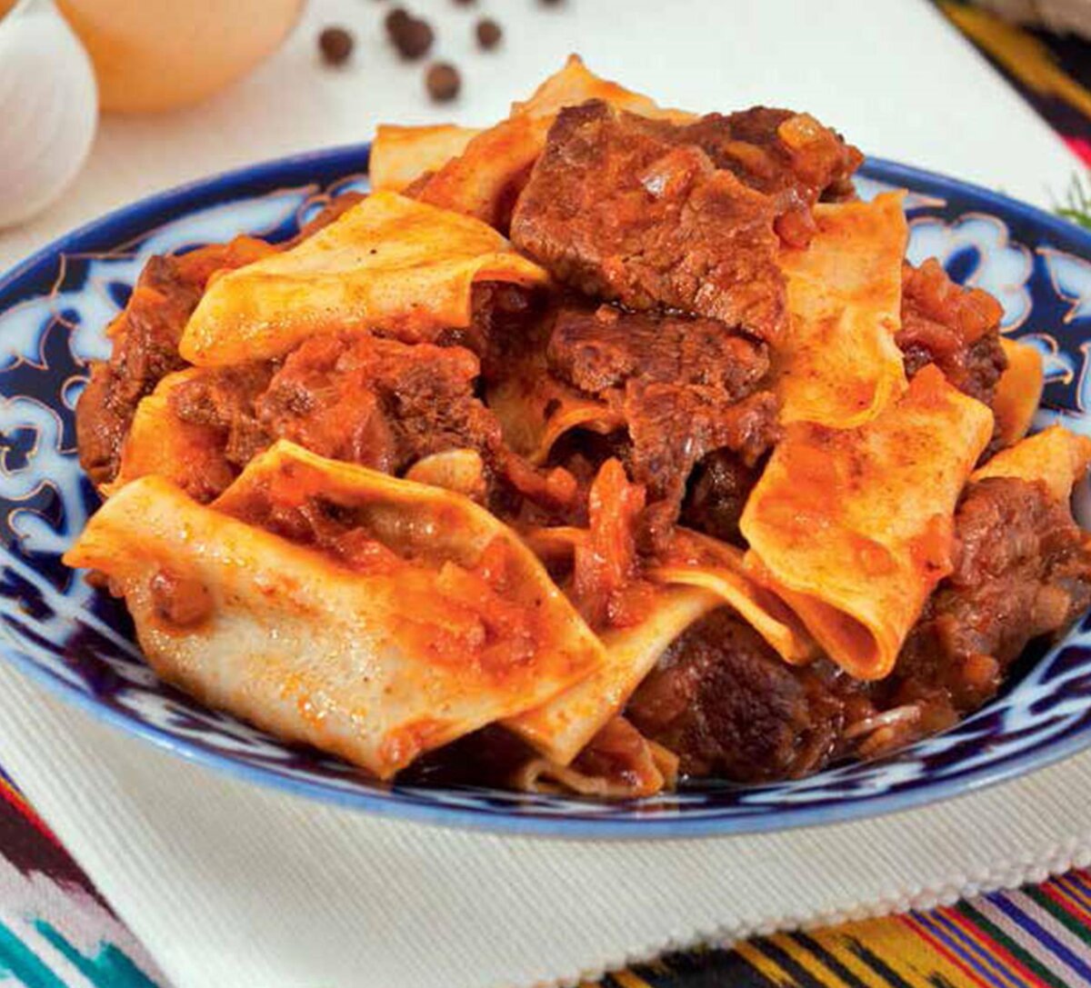 Время приготовления: 1 час Ингредиенты: 1 стакан пшеничной муки 100 мл воды 300 г филе говядины 2 ст. л. топлёного курдючного жира 1 крупная луковица 2 зубчика чеснока 1 ст. л. томатной пасты соль и перец по вкусу Приготовление: 1. Муку просеять на стол горкой, в центре сделать углубление, влить воду и замесить крутое тесто. 2. Раскатать тесто в тонкий пласт и нарезать небольшими квадратиками. Отварить их в подсоленной воде, откинуть в дуршлаг. 3. Говядину нарезать маленькими кусочками. На сковороде разогреть жир, обжарить мясо до румяной корочки. 4. Лук и чеснок очистить, мелко нарезать, добавить к мясу и обжаривать в течение 3–4 минут. 5. Добавить в сковороду томатную пасту, посолить, поперчить по вкусу, хорошо перемешать, тушить 8–10 минут. 6. В сковороду выложить отваренные квадратики теста, перемешать, прогреть в течение 3–4 минут и убрать с огня. Блюдо к столу подавать горячим. Всем пр