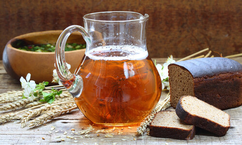 Необходимый перечень продуктов … - Фильтрованная вода: четыре литра; - Сухарики ржаные: восемьсот граммов; - Сахарный песок: двести пятьдесят граммов; - Дрожжевая закваска: двести миллилитров; - Мятный настой: двести миллилитров; - Лимонный сок: сто миллилитров. А готовится квас с мятой следующим образом! Воду вылить в кастрюлю и поставить на конфорку, заранее включенную на максимальный уровень огня. Вскипятить и опустить сухарики в жидкость. Накрыть плотно крышкой и унести кастрюлю в комнату, поставить у батареи и выждать двенадцать часов. Как пройдёт время, добавить в получившуюся хлебную кашицу, дрожжевую закваску, после залить мятным настоем, вымешать и снова плотно накрыть крышкой. Выждать ещё четыре часа. Прошло необходимое время, и в жидкость засыпать сахар. Вымешать и вновь плотно накрыть крышкой. Выждать двадцать четыре часа, дабы жидкость сквасилась. Прошло время, унести кастрюлю на кухню и снять с поверхности образовавшуюся пену. Включить конфорку на минимальный уровень о
