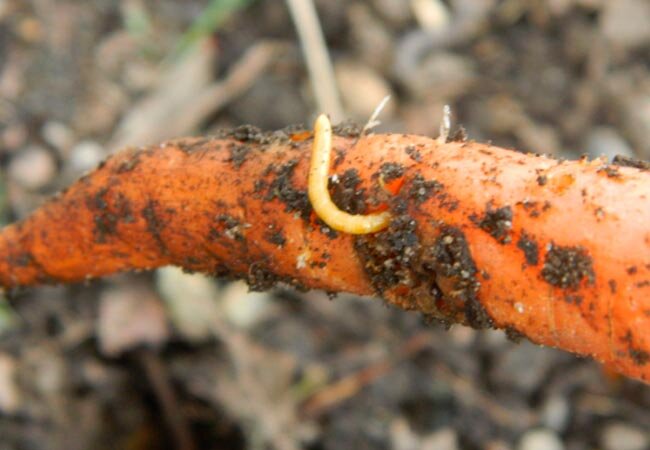 Резная красивая листва на грядке – именно так выглядит морковь. Когда она становится мощной, ее подстерегает опасность – проволочник. Эти червяки являются подземными вредителями. Живут они в затененных увлажненных местах. С наступлением тепла самки откладывают личинки на глубине почвы до 3 см. Вредитель имеет желтоватое или желто-коричневое плотное цилиндрическое тело, длиной от 15 до 25 мм. Когда температура нормализуется, они поднимаются на поверхность почвы, чтобы найти пищу. Борьба с проволочником становится одной из главных задач для большинства огородников.