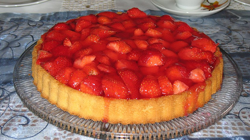 Выпекают тесто до готовности при среднем жаре. Когда остынет, выкладывают начинку из свежей цельной клубники.