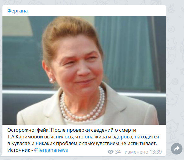 Утром 27 мая Сеть взбудоражила "новость" о том, что супруга покойного президента Узбекистана Ислама Каримова тоже отдала Богу душу. Однако на поверку эта информация оказалась фейком. Подписывайтесь на канал "Ферганы" в Telegram, чтобы быть в курсе событий! https://t.me/fergananews