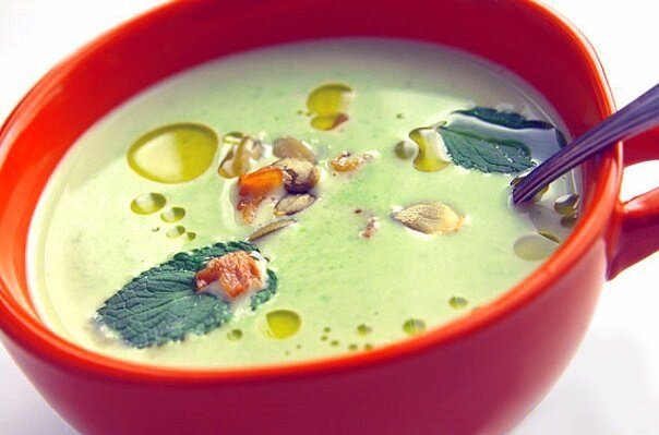 Для приготовления супа нам потребуется: 1.Сливочное масло-3 ст. ложки. 2.Измельчённая средняя луковица-1 шт. 3.Куринный бульон-3,5 стакана(875 мл.) 4.Измельчённая большая картофелина-1 шт. 5.Замороженный зелёный горошек-3,5 стакана. 6.Свежей измельчённой петрушки-3 ст. ложки. 7.Свежих, измельчённых листьев мяты-3 ст. ложки. 8.Воды-1 стакан. 9.Чёрного,молотого перца-1/2 ч. ложки. 10.Слегка взбитые сливки-1/4 стакана. НАЧНЁМ ГОТОВИТЬ: 1.В большой кастрюле растопите масло на небольшом огне. 2.Лук готовте 3 минуты, пока он не станет мяггким. 3.Влейте туда куринный бульон и положите нарезанный картофель. 4.Накройте крышкой и уменьшите огонь. Готовте примерно 10 минут,пока картофель не станет мягким. 5.Положите горох. Тушите, накрыв, 3 минуты, пока горох не станет мягким. 6.Добавте петружку и мяту. 7.С помошью домашних приспособлений(комбайн,миксер) сделайте из супа пюре. 8.В готовое пюре влейте воду и поперчите. 9.Готовте на медленном огне 3 минуты до однородной консистенции. 10.Перед пода