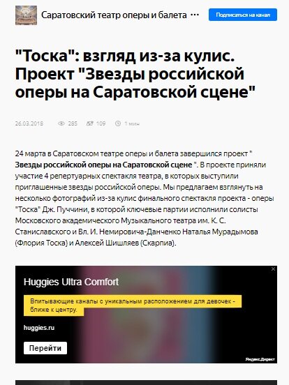 В нашу редакцию обратилась Марина М, которая удивляется рекламе подгузников на официальной странице Саратовского академического театра оперы и балета в «Яндекс дзен». Публикуем письмо Марины полностью. "Последние года два всю информацию я черпаю из интернета. И очень обрадовалась, когда мой любимый Саратовский оперный театр организовал свои страницы во всех социальных сетях. Поэтому я с радостью открыла и официальную страницу театра в Яндекс Дзен. https://zen.yandex.ru/operabalet64 И тут меня ждал сюрприз. Конечно, я слышала о недостатке финансирования культуры. Но чтобы академический оперный театр, учрежденный министерством культуры региона, рекламировал памперсы для пожилых? Такого я еще не встречала! Конечно, может быть производители подгузников являются спонсорами театра? Но об этом больше нигде ничего не сказано. Реклама для целевой театральной аудитории? Как-то совсем мне стало от этого плохо, и абсолютно расхотелось ходить в оперный. Полистав странички официального представ