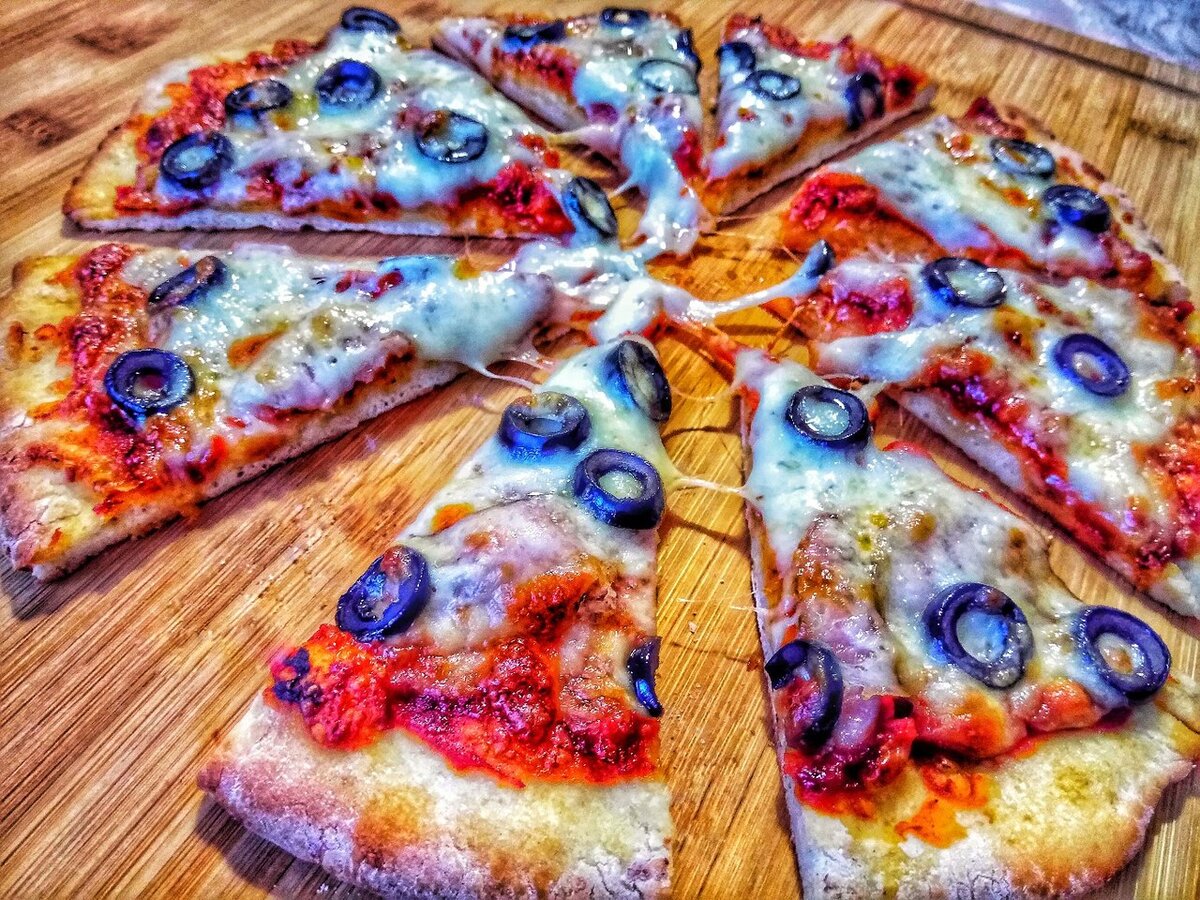 Соскучился по итальянской кухне??? Тогда пора вспомнить про пиццу... А вот тебе и рецепт, самого вкусного и простого итальянского блюда... С тонким тестом и тянущемся сыром... Ингредиенты в тесто: 280 г муки 10 г сухих дрожжей 150 мл воды 20 мл оливкового масла 1 ч.л. соли 1 ч.л. сахара Ингредиенты в соус: 0,5 головки лука 1 зубчик чеснока 3 ст.л. томатной пасты 50 мл воды по вкусу перец сахар соль для жарки растительное масло Ингредиенты в саму пиццу: 100 г ветчины 100 г моцареллы 80 г маслин Шаг 1 Просей муку. Сюда же дрожжи, соль и сахар. Все перемешай. Шаг 2 Теперь воды подлей, оливковое масло добавляй. Шаг 3 Вымешивай пока не станет отлипать. И где то-час, под теплым полотенцем стоит тесто подержать. Шаг 4 Займись-ка соусом пока. Для этого лук нужно мелко резать. И так же мелко зубчик чеснока. Шаг 5 На сковородке медленно обжарь чеснок и лук. Пока не побелеет. В районе двух минут. Шаг 6 Добавь томатной пасты. По вкусу перце, сахар, соль. Перемешай. Шаг 7 Теперь добавь в