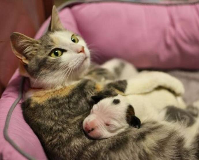 Животные подружились с первого момента их встречи, поэтому было принято решение оставить их вместе, пока Ноланд не подрастет. Щенок буквально влился в кошачью семью: у Лурлен родились четверо котят. Но спустя шесть месяцев, щенка пришлось поместить к другим собакам, так как ему ещё надо научиться быть собакой. Вот такой интересный и разнообразный мир вокруг нас!