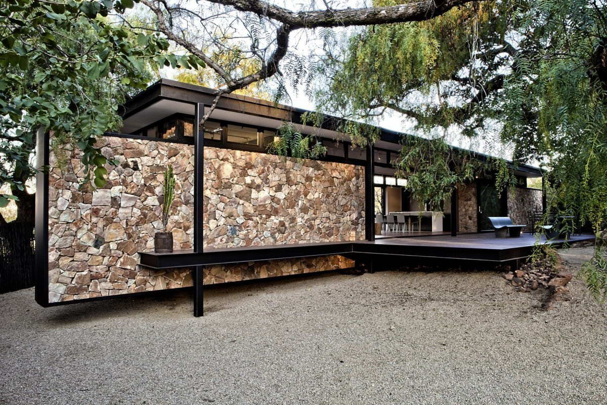 Этот небольшой стеклянный павильон построен на живописном участке на вершине хребта с панорамным видом на Йоханесбург. У дома стальной каркас — такой выбор обусловлен желанием минимального физического воздействия на участок, а в сочетании с простой формой и практически сплошным остеклением и минимального визуального воздействия на окружающую природу. Кроме того, сложное окружение не позволяет попасть на участок крупной строительной технике, а металлические конструкции были перенесены с дороги на участок вручную. Особый эффект создают стены из натурального камня, что хорошо сочетается и с лёгкими основными конструкциями, и с естественными валунами на участке. Планировка у дома элементарная — по торцам расположены две спальни с примыкающими санузлами, в центральной части — общая зона с кухней-столовой-гостиной. Название: Павильон Вестклифф (Westcliff Pavilion) Расположение: Вестклифф, Йоханнесбург, Южная Африка Архитектура: GASS Architecture Studios Фото: Bernard Viljoen В этом проекте и