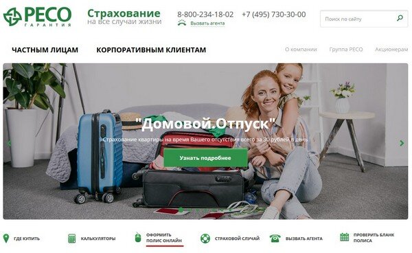 Заходим на страницу http://www.reso.ru/Online/, где выбираем в меню Частным лицам > ОСАГО > Онлайн-покупка полиса.