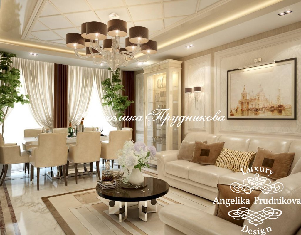 Дизайн квартиры в жилом комплексе «Крылатский», расположенном в одном из самых живописных районов Москвы, решен в стиле модерн. Светлые тона создают в интерьере ощущение простора и воздушности. Мебель молочно-кремовых и шоколадных оттенков с глянцевым отливом, подсветка по периметру потолка золотистого цвета, люстра в стиле модерн, молдинги на стенах придают интерьеру классически завершенный, торжественный вид. Студийное пространство гостиной-столовой соединяется с кухней с помощью прямоугольного арочного проема. Автору проекта, дизайнеру интерьеров Анжелике Прудниковой, удалось воссоздать в этом помещении особый дух эпохи модерна, но в современной обработке. Интерьер спальни в квартире в стиле модерн выполнен в светлых тонах. Массивное изголовье кровати с «каретной» стяжкой в сочетании с изящной мебелью с изысканными изгибами, нежная молочно-кремовая цветовая гамма создают атмосферу аристократичности и уюта одновременно. На лоджии, примыкающей к спальне, оборудована небольшая зона от